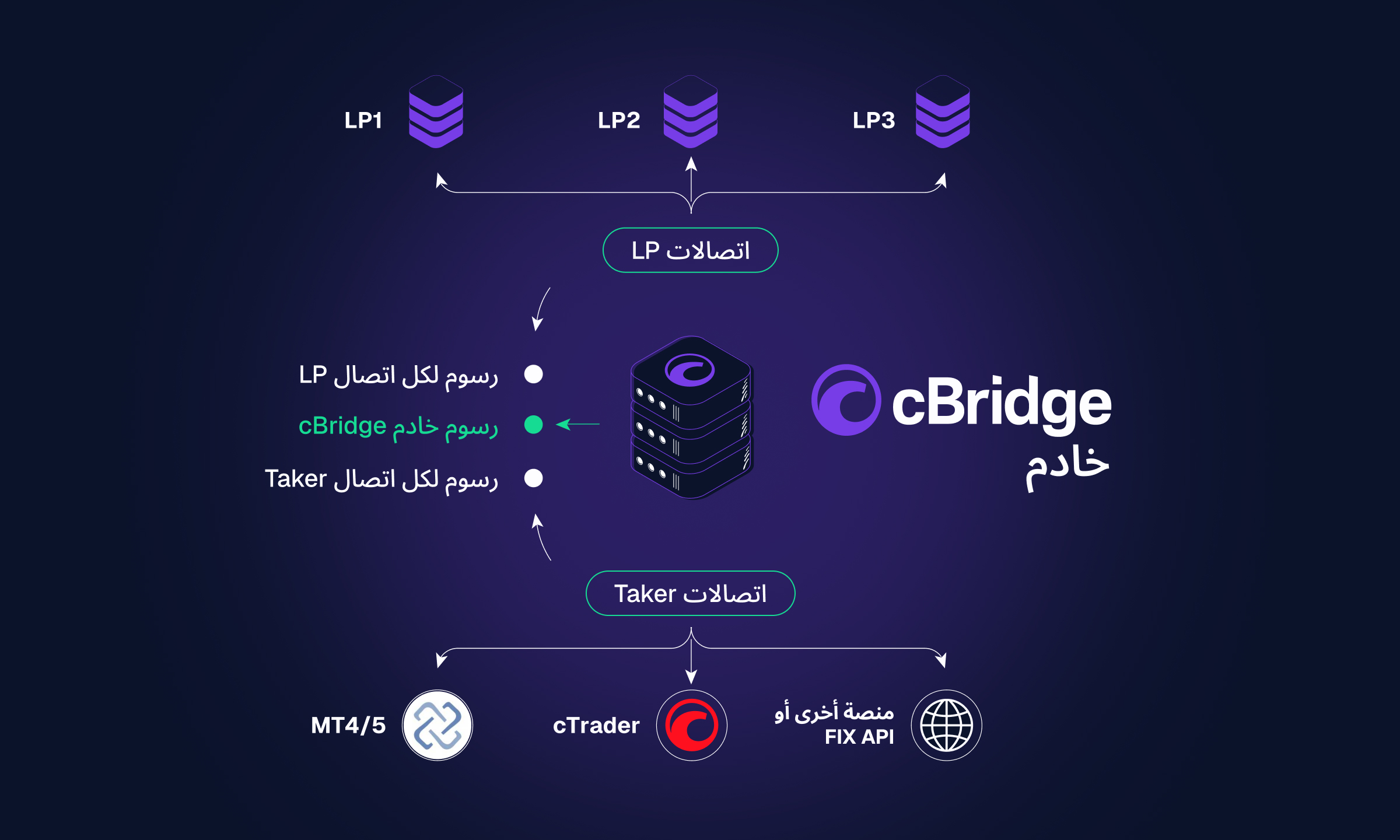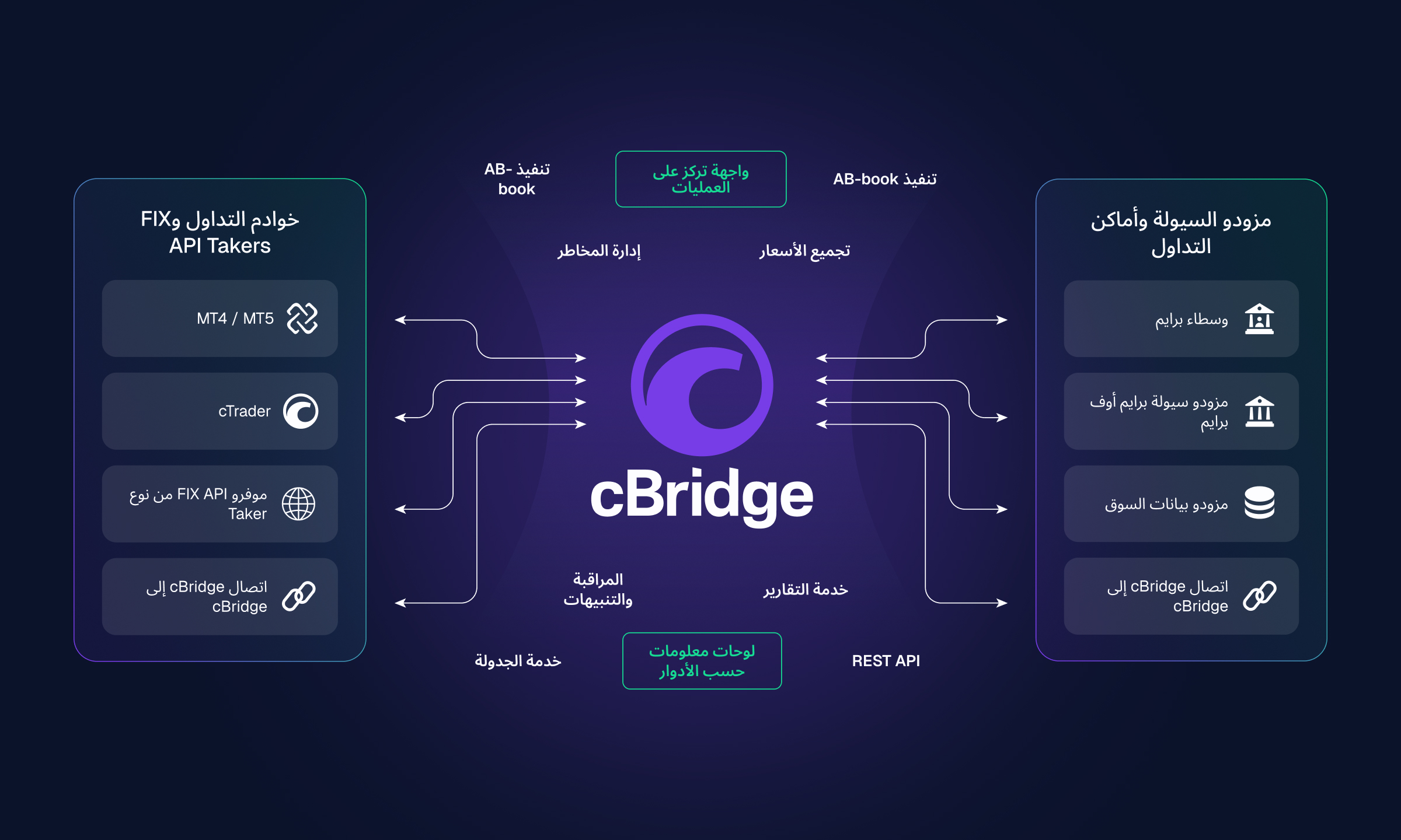 يعمل cBridge كحل مستقل تمامًا، يربط بيئات cTrader وMT4 وMT5 وFIX API بمزودي سيولة متعددين. يدير الوسطاء الوصول إلى السيولة والتوجيه والتنفيذ في مكان واحد، مع تطبيق تسعير عروض الأسعار الموحد وقواعد التوجيه عبر جميع الخوادم المتصلة. تحافظ عمليات التكامل الجاهزة والتغطية الواسعة للبروتوكول عبر التداول والتسعير وإعداد التقارير على احتواء عملية التنفيذ.