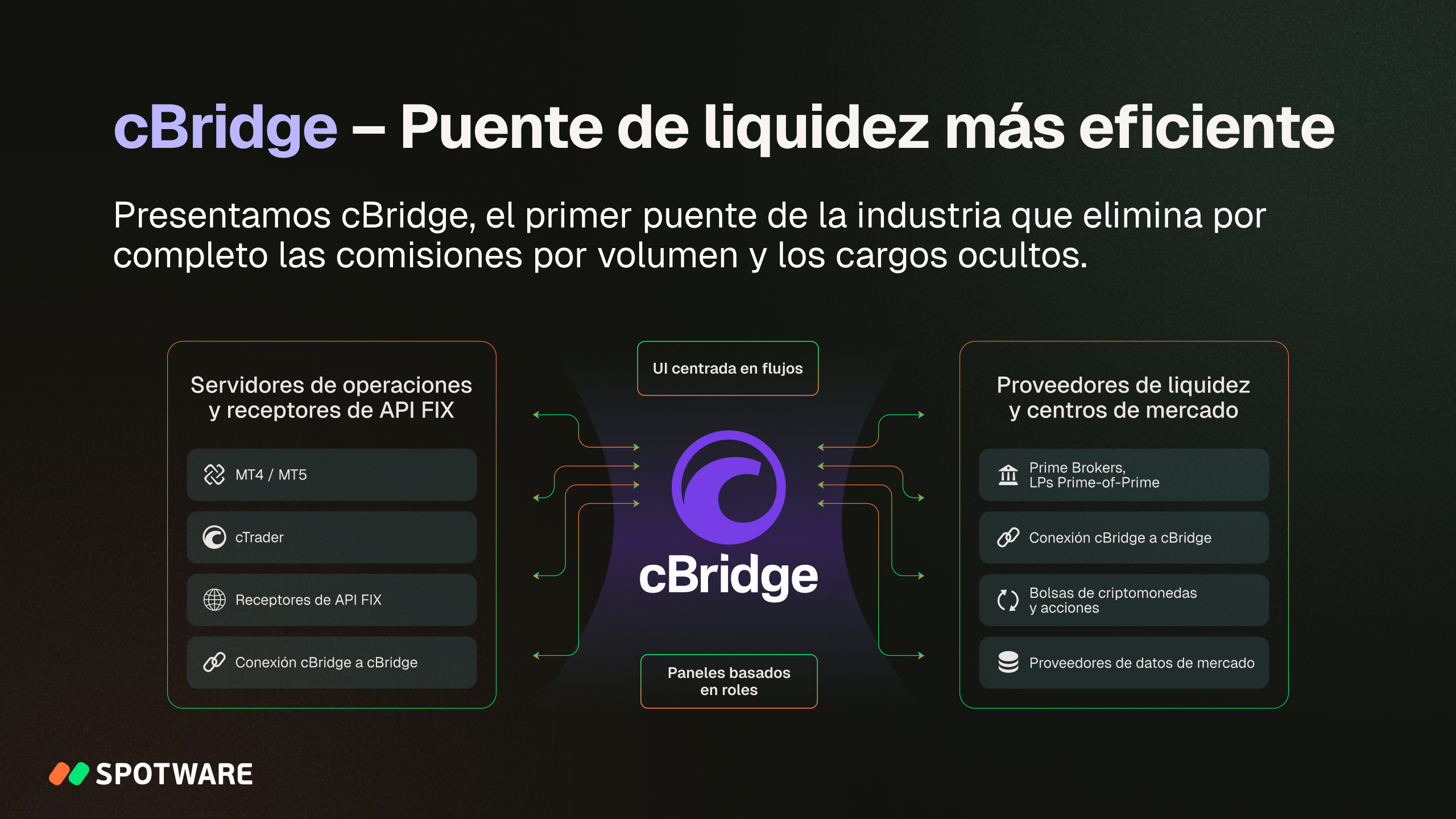 Después de años de desarrollo, Spotware introdujo cBridge al mercado en 2025. Una solución moderna centrada en los brókeres para la conectividad de liquidez, cBridge es altamente rentable, eliminando por completo las comisiones por volumen y los cargos ocultos. Combina una arquitectura modular escalable y un diseño centrado en el flujo de trabajo. La validación de configuraciones cruzadas y las comprobaciones intuitivas del estado de los conjuntos de reglas garantizan un funcionamiento seguro.