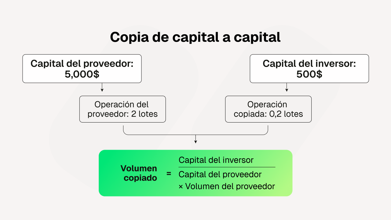En lugar de copiar tamaños de lote sin procesar, cTrader Copy dimensiona la operación de cada inversor en función de la relación entre el capital del inversor y el capital del proveedor de estrategias en el momento de la operación. El volumen de copia se define de la siguiente manera: