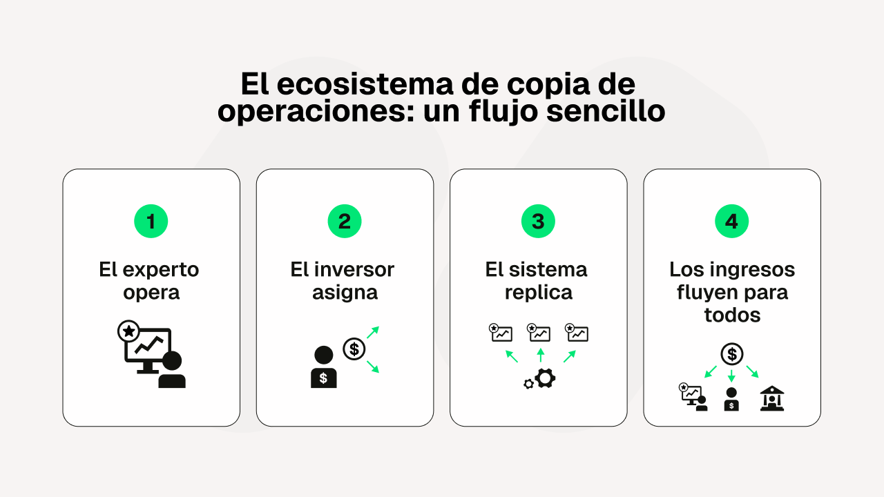 La copia de operaciones ofrece un punto de entrada diferente. En lugar de pedirles que diseñen y ejecuten su propia estrategia, los clientes pueden revisar estrategias en vivo con historiales de rendimiento transparentes, asignar una cantidad definida y confiar en controles claros como la protección de capital. El mensaje cambia de "aprenda a operar primero" a "comience con una forma estructurada y transparente de participar y aprender".