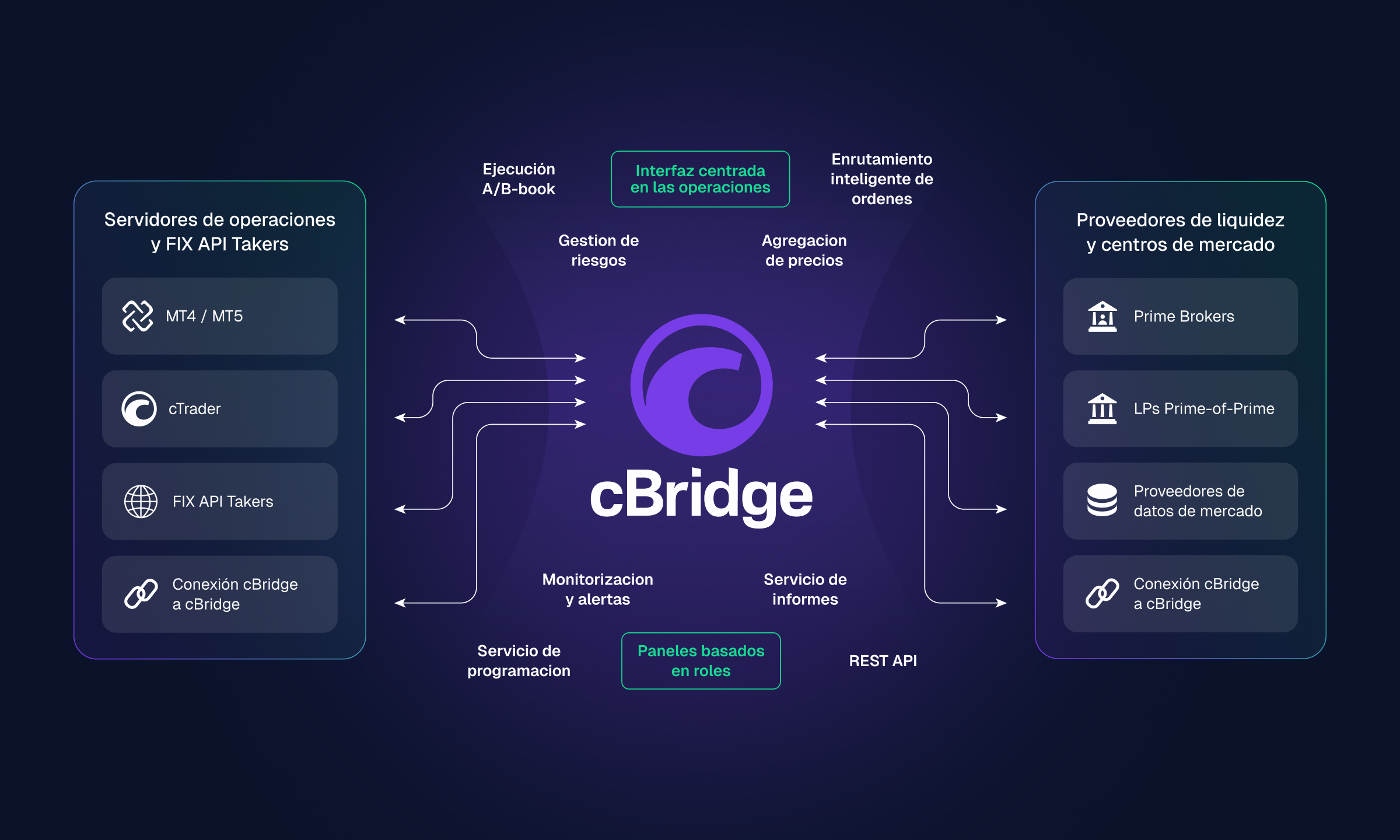 cBridge funciona como una solución completamente independiente, que conecta los entornos cTrader, MT4, MT5 y FIX API con múltiples proveedores de liquidez. Los brókeres gestionan el acceso a la liquidez, el enrutamiento y la ejecución en un solo lugar, con precios de cotización unificados y reglas de enrutamiento aplicadas en todos los servidores conectados. Las integraciones prediseñadas y la amplia cobertura de protocolos en operaciones, precios e informes permiten acotar el proceso de implementación.