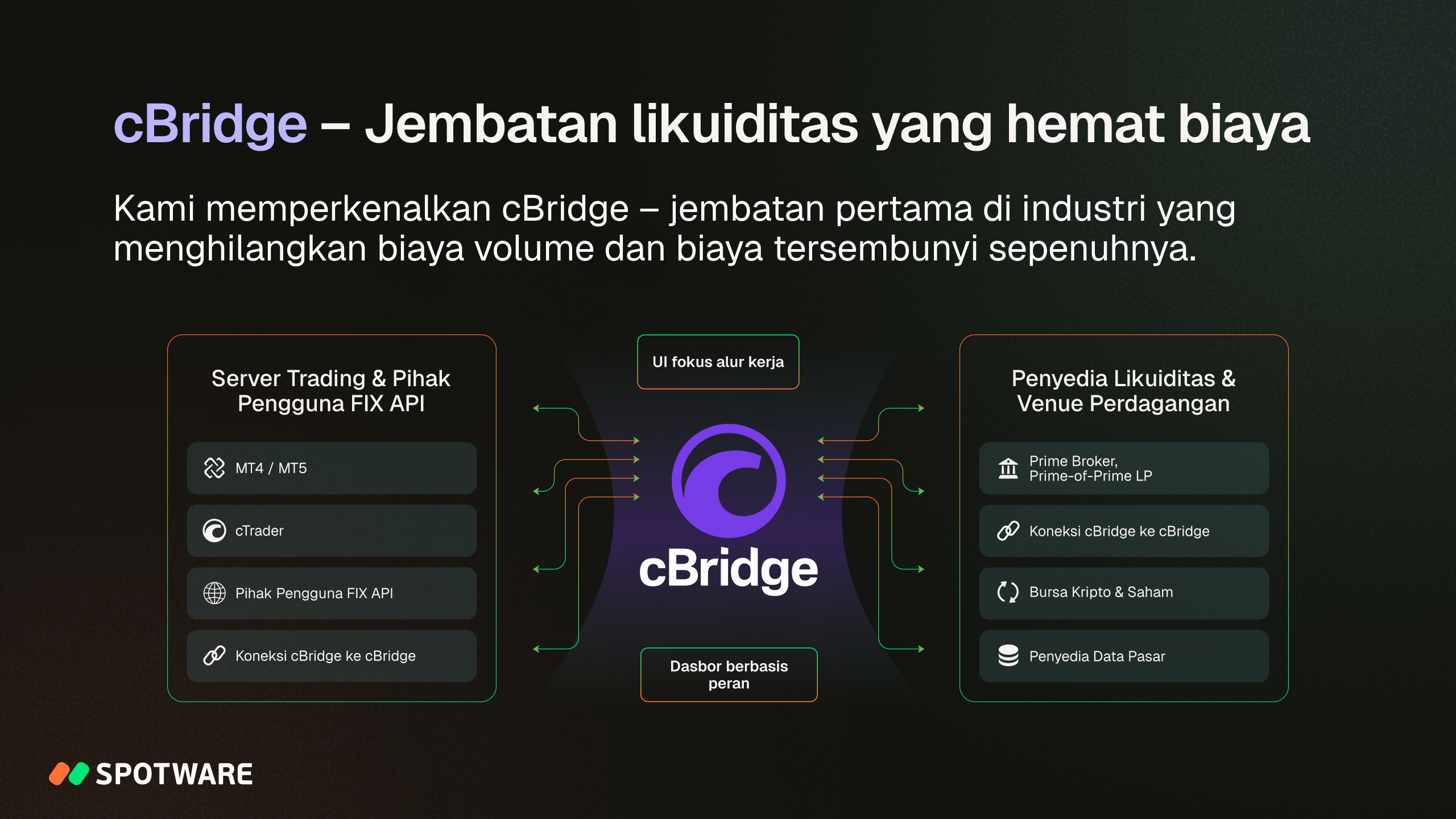 Setelah bertahun-tahun pengembangan, Spotware memperkenalkan cBridge ke pasar pada tahun 2025. Sebuah solusi modern yang berfokus pada broker untuk konektivitas likuiditas, cBridge sangat hemat biaya, menghilangkan biaya volume dan biaya tersembunyi sepenuhnya. Ini menggabungkan arsitektur modular yang skalabel dan desain yang mengutamakan alur kerja. Validasi pengaturan silang dan pemeriksaan kesehatan intuitif dari set aturan memastikan operasi yang aman.