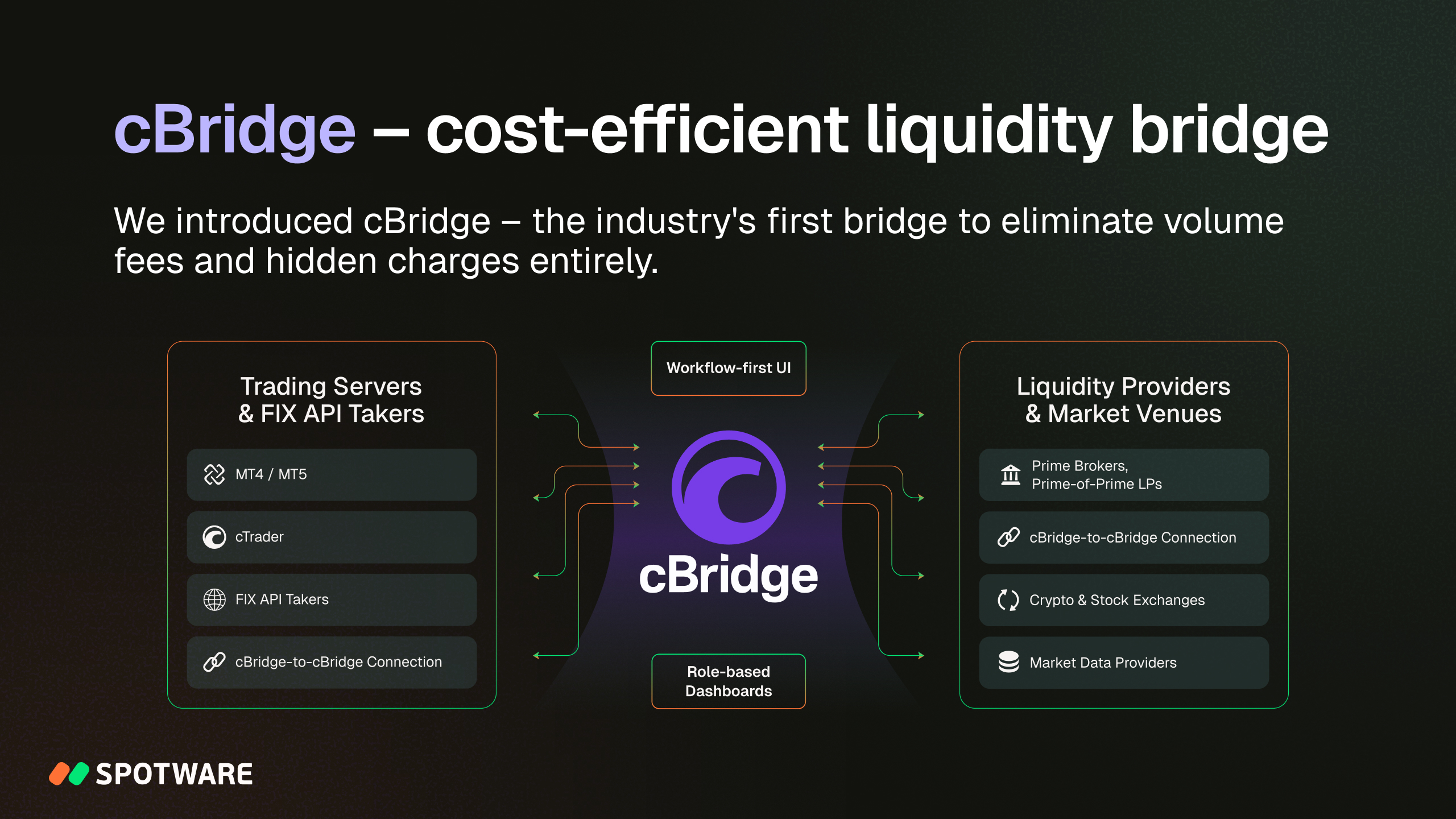 After years of development, Spotware introduced cBridge to market in 2025. A modern, broker-focused solution for liquidity connectivity, cBridge is highly cost-efficient, eliminating volume fees and hidden charges entirely. It combines a scalable modular architecture and workflow-first design. The validation of cross-settings and intuitive health checks of rule sets ensure safe operation.
