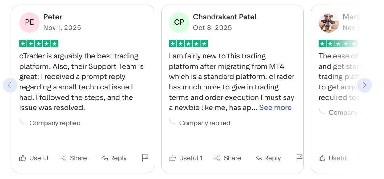 The overall tone of Trustpilot reviews reflects that traders value how naturally cTrader fits into their day-to-day workflow. Many point out that the platform feels intuitive from the first use, allowing them to focus on their trading rather than on figuring out the interface. Users transitioning from legacy platforms often mention that cTrader requires less adjustment and quickly becomes their preferred environment. Reviewers also note that the platform provides a dependable foundation for developing and testing trading approaches, which contributes to a more confident and structured trading experience.