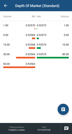 The Standard Depth of Market (DOM) feature, found in Mobile Symbol Overview, displays the liquidity for securities and currencies at different price levels, offering further trader insights and elevated convenience of analysis.