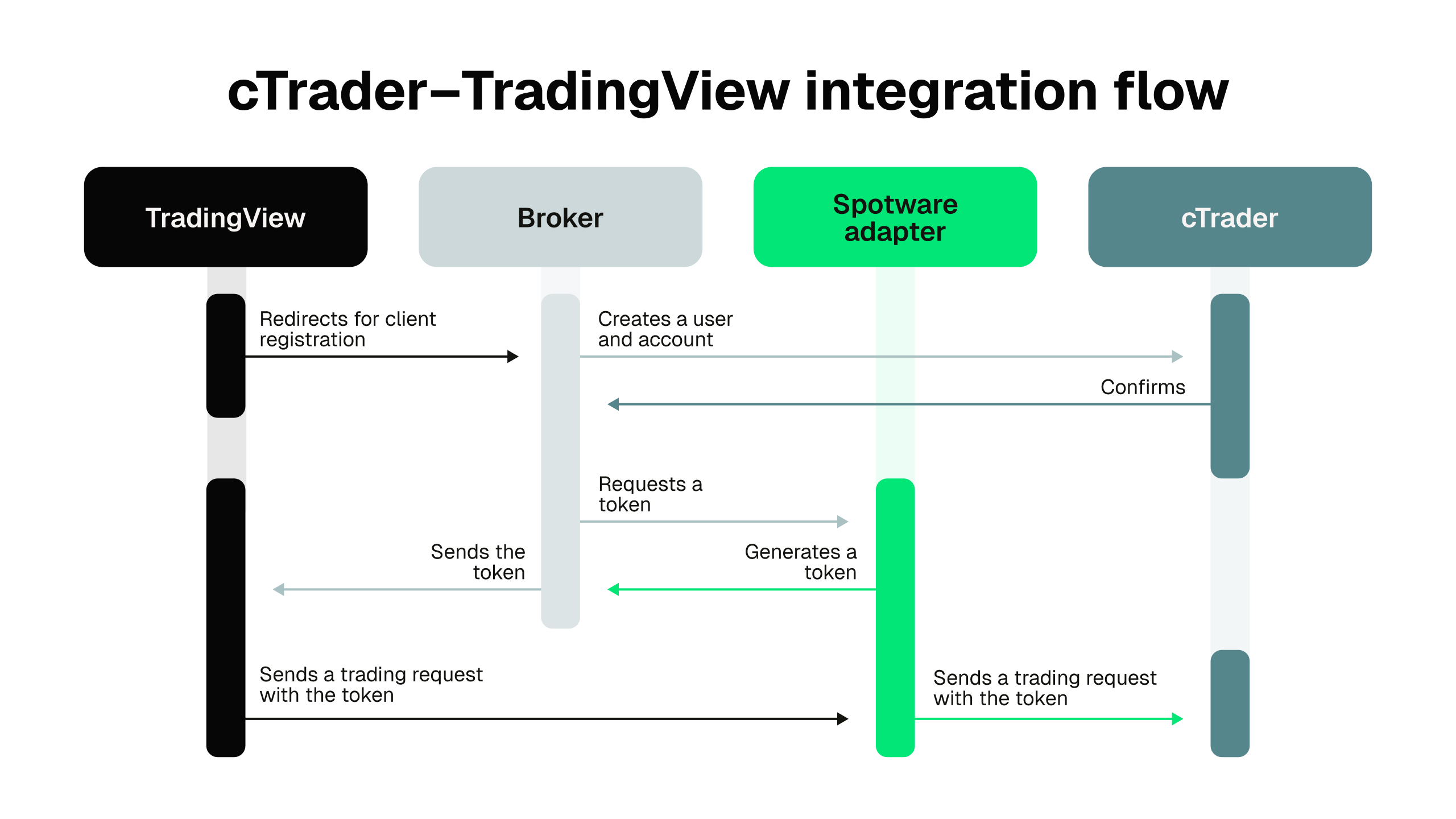 The integration is enabled through a dedicated adapter developed exclusively by Spotware, ensuring a stable link between the TradingView interface and the cTrader backend. Brokers can seamlessly add an additional trading interface without altering their existing infrastructure. Spotware handles the adapter deployment and configuration, allowing orders initiated in TradingView to be processed by the cTrader backend, using the broker’s established setup, risk controls and connectivity.