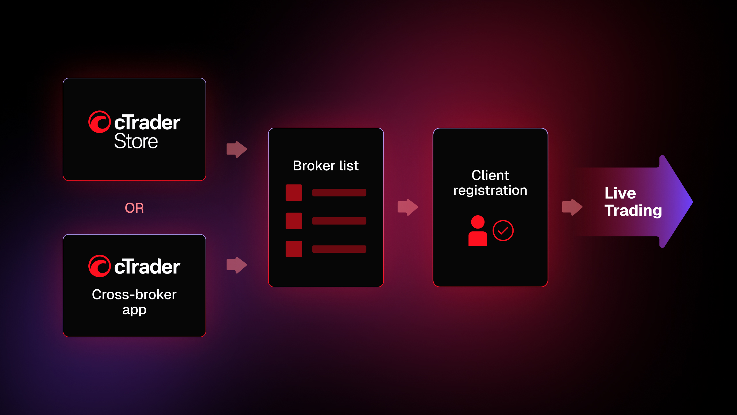 The conversion path looks as follows: cTrader Store OR cross-broker cTrader app → Broker list → Client registration → Live trade.