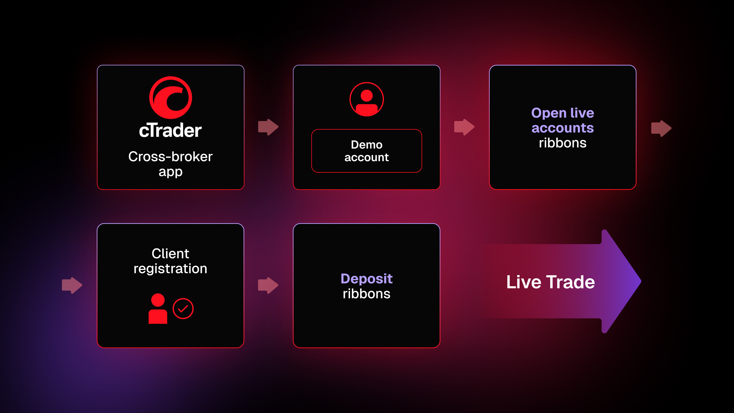 Here is an example of how the flow works using in-app ribbons as one of targeted mechanics: Cross-broker cTrader app → Demo account → Open live accounts ribbons → Client registration → Deposit ribbons → Live trade.