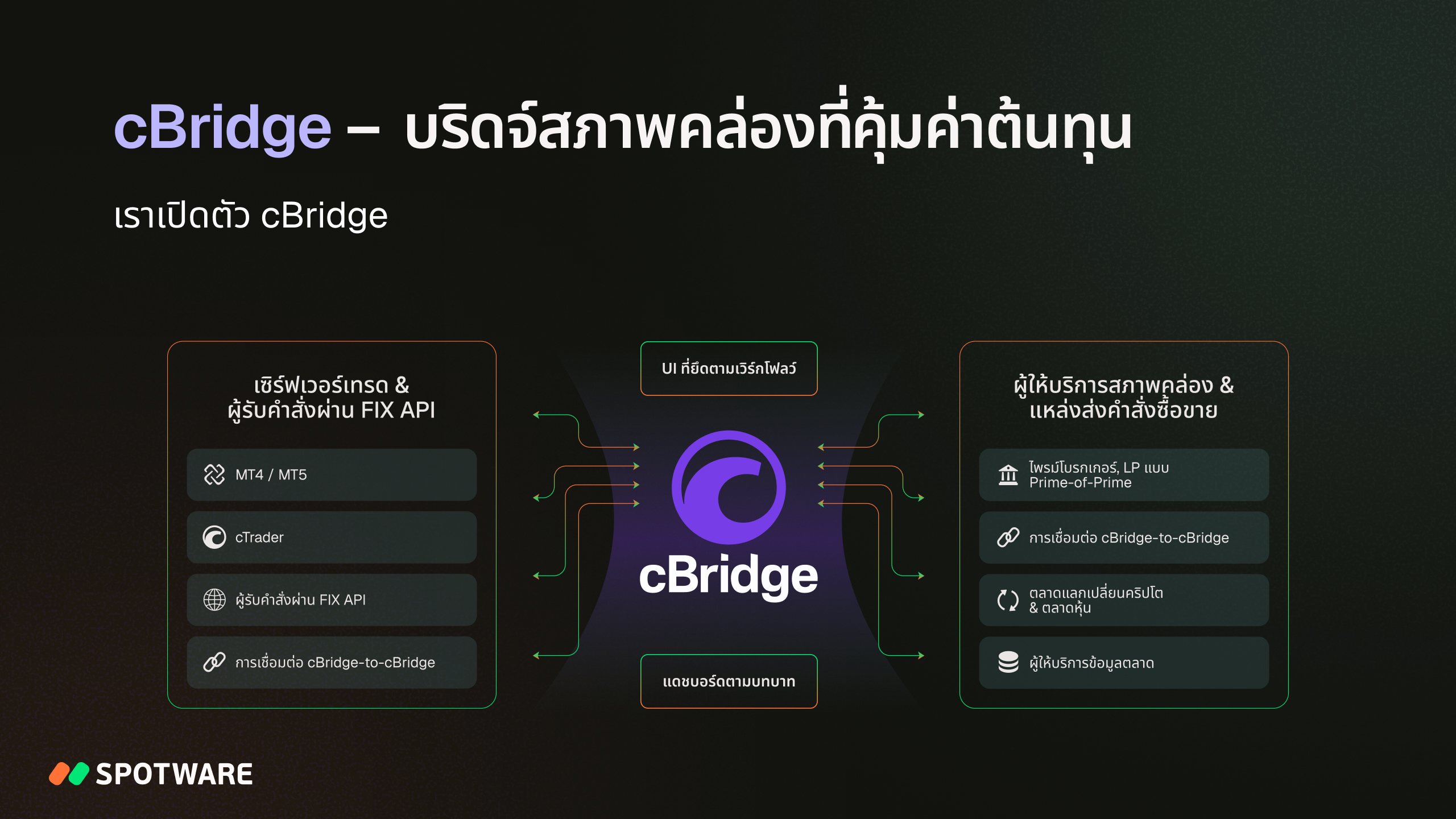 หลังจากหลายปีของการพัฒนา Spotware ได้เปิดตัว cBridge สู่ตลาดในปี 2025 โซลูชันสมัยใหม่ที่มุ่งเน้นโบรกเกอร์สำหรับการเชื่อมต่อสภาพคล่อง cBridge มีประสิทธิภาพด้านต้นทุนสูง โดยขจัดค่าธรรมเนียมปริมาณและค่าธรรมเนียมแฝงทั้งหมด มันรวมเอาโครงสร้างแบบโมดูลาร์ที่ปรับขนาดได้และการออกแบบที่เน้นเวิร์กโฟลว์เป็นหลัก การตรวจสอบการตั้งค่าข้ามระบบและการตรวจสอบสถานะของชุดกฎอย่างเป็นธรรมชาติช่วยให้การทำงานปลอดภัย