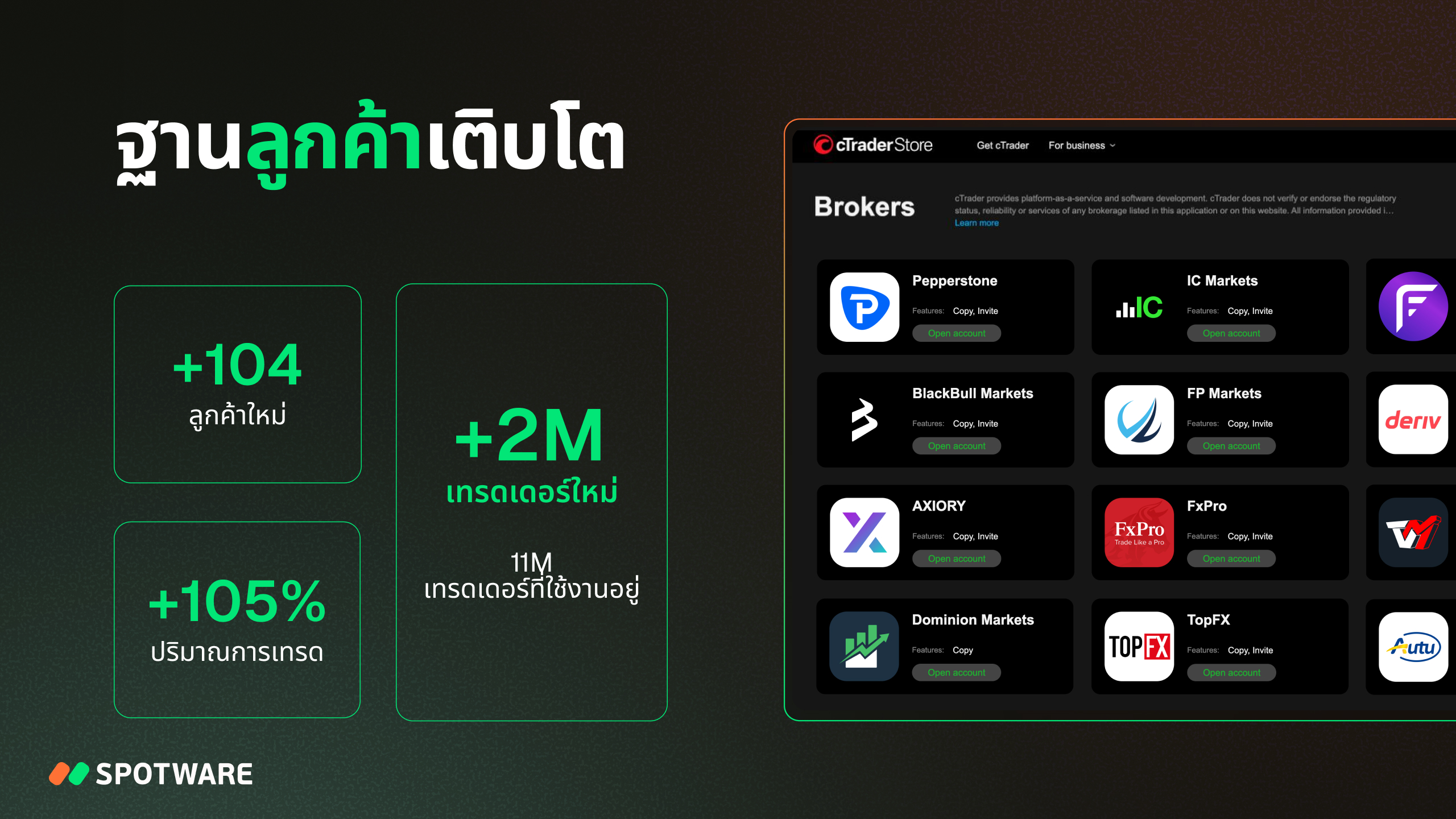 Spotware ไม่ได้ถูกกำหนดด้วยผลิตภัณฑ์เดียวอีกต่อไป ในอุตสาหกรรมที่เคลื่อนไหวอย่างรวดเร็ว เราจะยังคงสร้างนวัตกรรมและพัฒนาโซลูชันใหม่ๆ เพื่อคงอยู่ที่แนวหน้าของเทคโนโลยีการเทรด