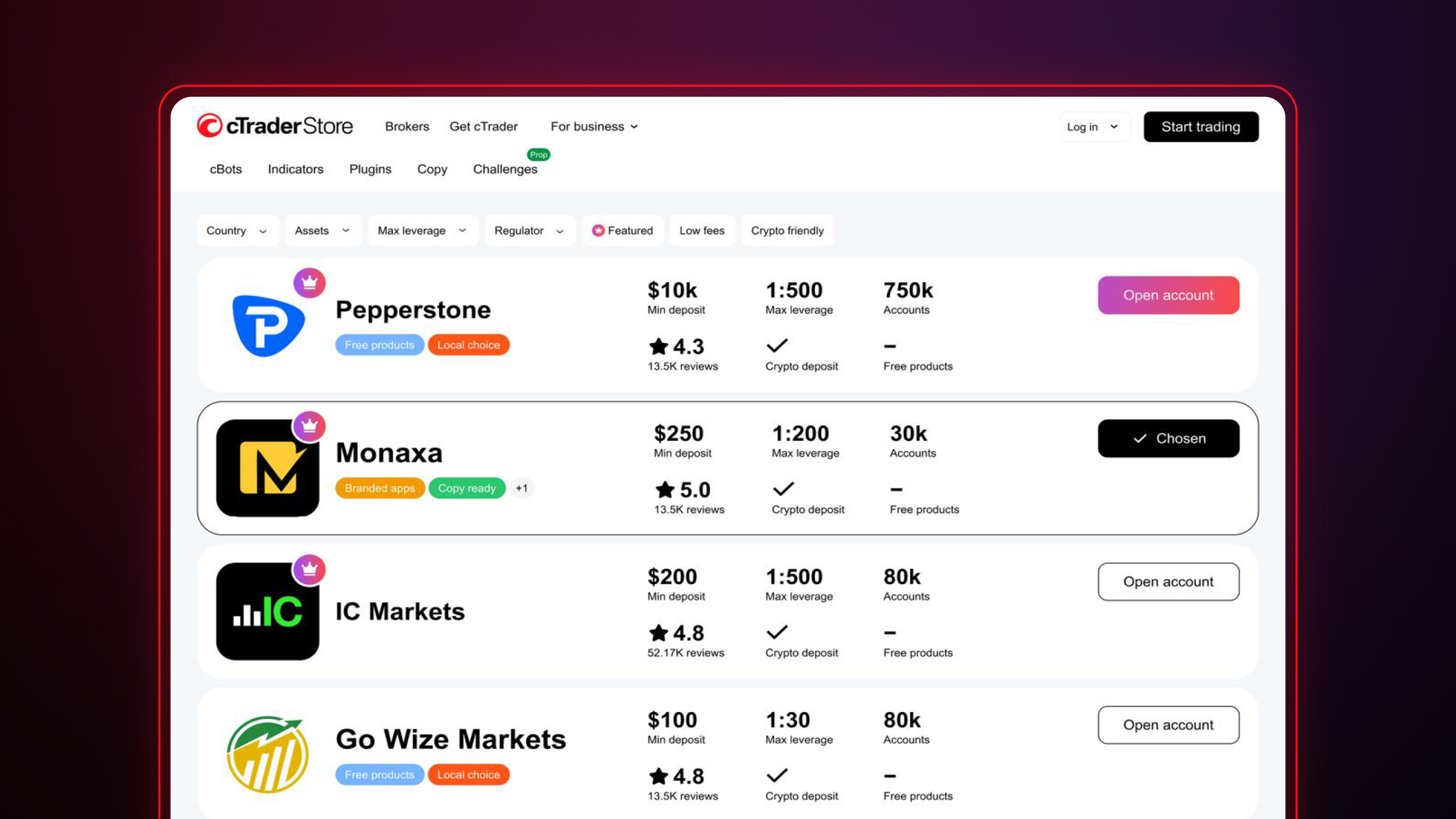 ใน cTrader Store และแอป cTrader ข้ามโบรกเกอร์ นักเทรดได้รับเชิญให้เริ่มเทรดและสำรวจรายชื่อโบรกเกอร์ cTrader ที่เชื่อถือได้เป็นประจำ เนื่องจากมีเพียงโบรกเกอร์ที่มีชื่อเสียงเท่านั้นที่ถูกระบุไว้ในสภาพแวดล้อมที่ต้านทานการหลอกลวงของ cTrader การปรากฏตัวใน Store จึงช่วยให้โบรกเกอร์สร้างความไว้วางใจกับนักเทรดที่มีแนวโน้มได้ เมื่อพวกเขาเลือกโบรกเกอร์ พวกเขาจะถูกนำไปยังเว็บไซต์ของโบรกเกอร์เพื่อลงทะเบียนและดำเนินการเริ่มต้นใช้งานต่อ