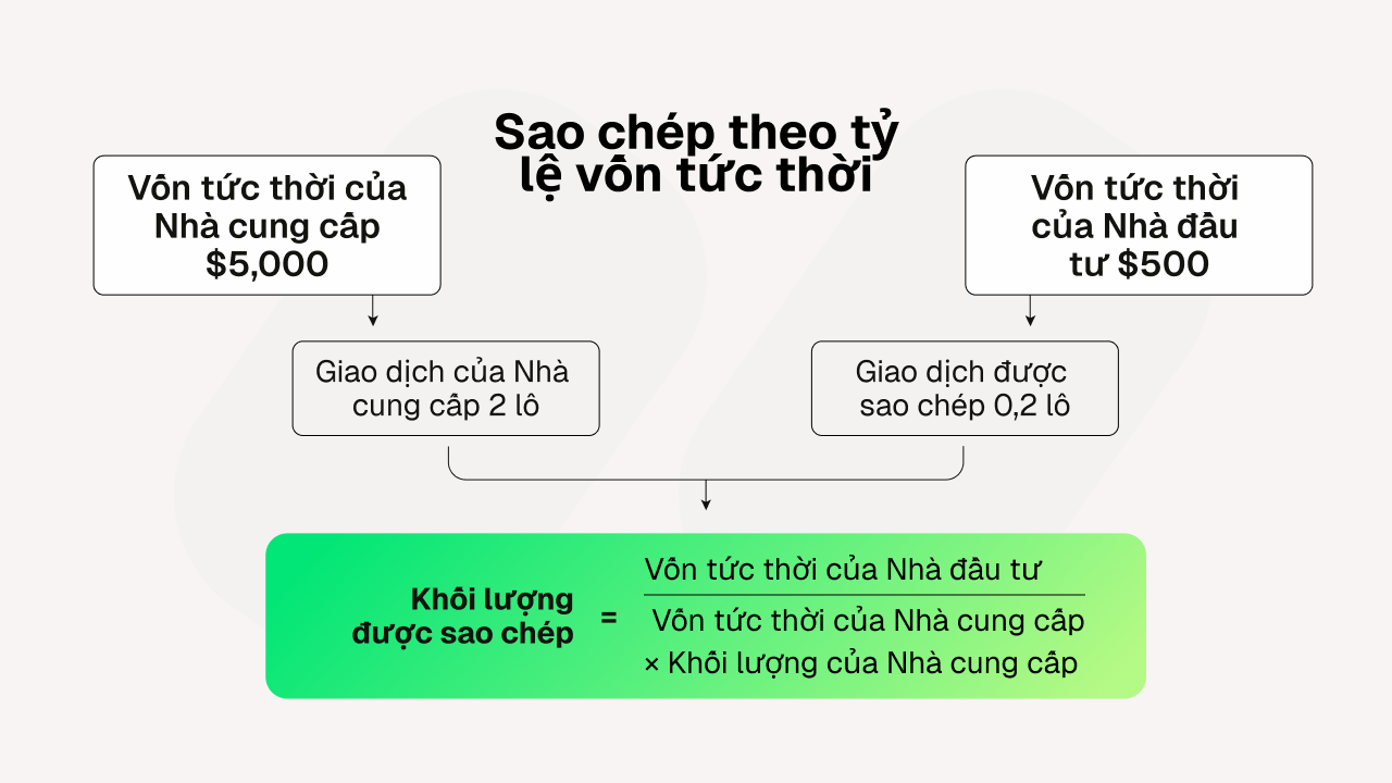 Thay vì sao chép khối lượng giao dịch thô, cTrader Copy điều chỉnh khối lượng giao dịch của mỗi nhà đầu tư dựa trên tỷ lệ giữa vốn tức thời của nhà đầu tư và vốn tức thời của nhà cung cấp chiến lược tại thời điểm giao dịch. Khối lượng sao chép được xác định như sau: