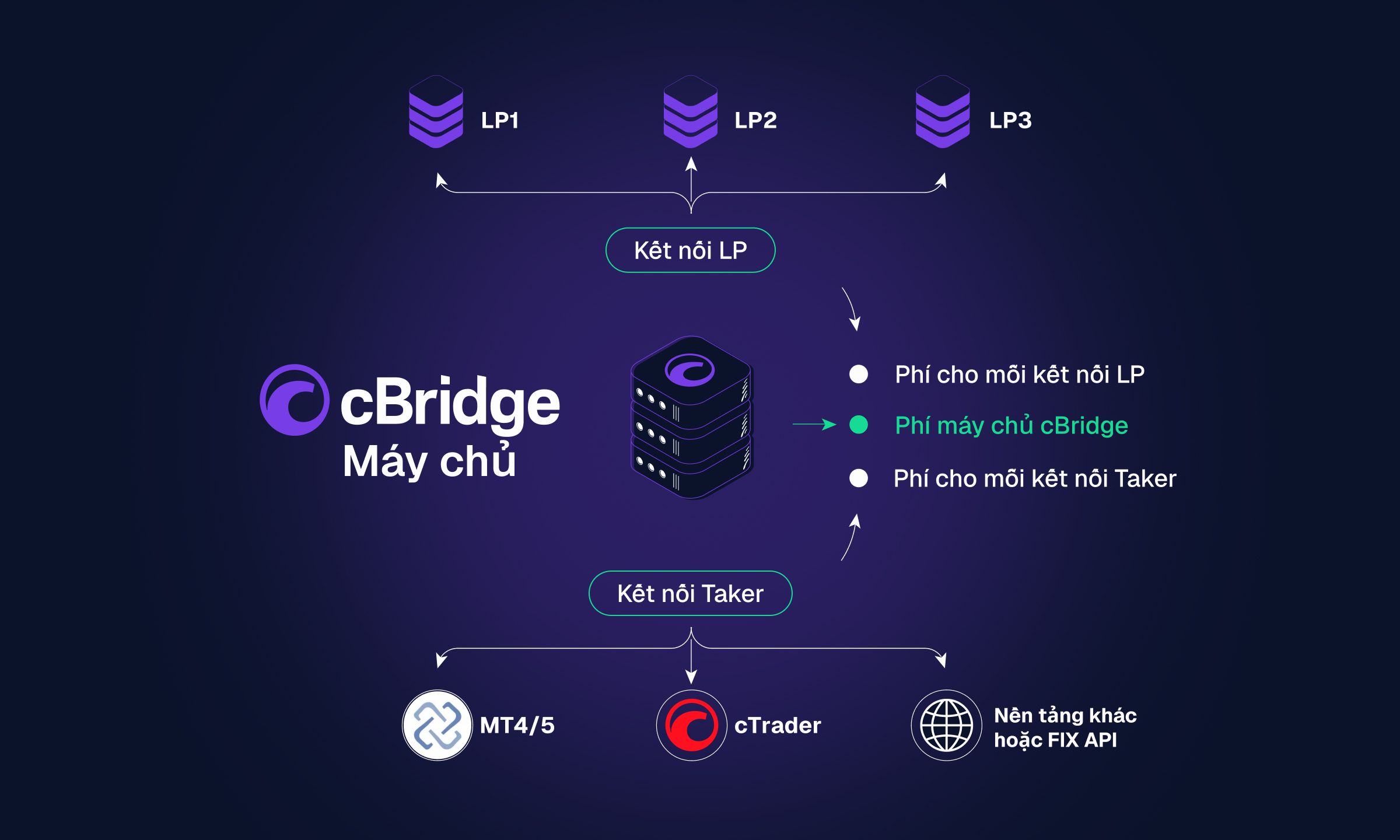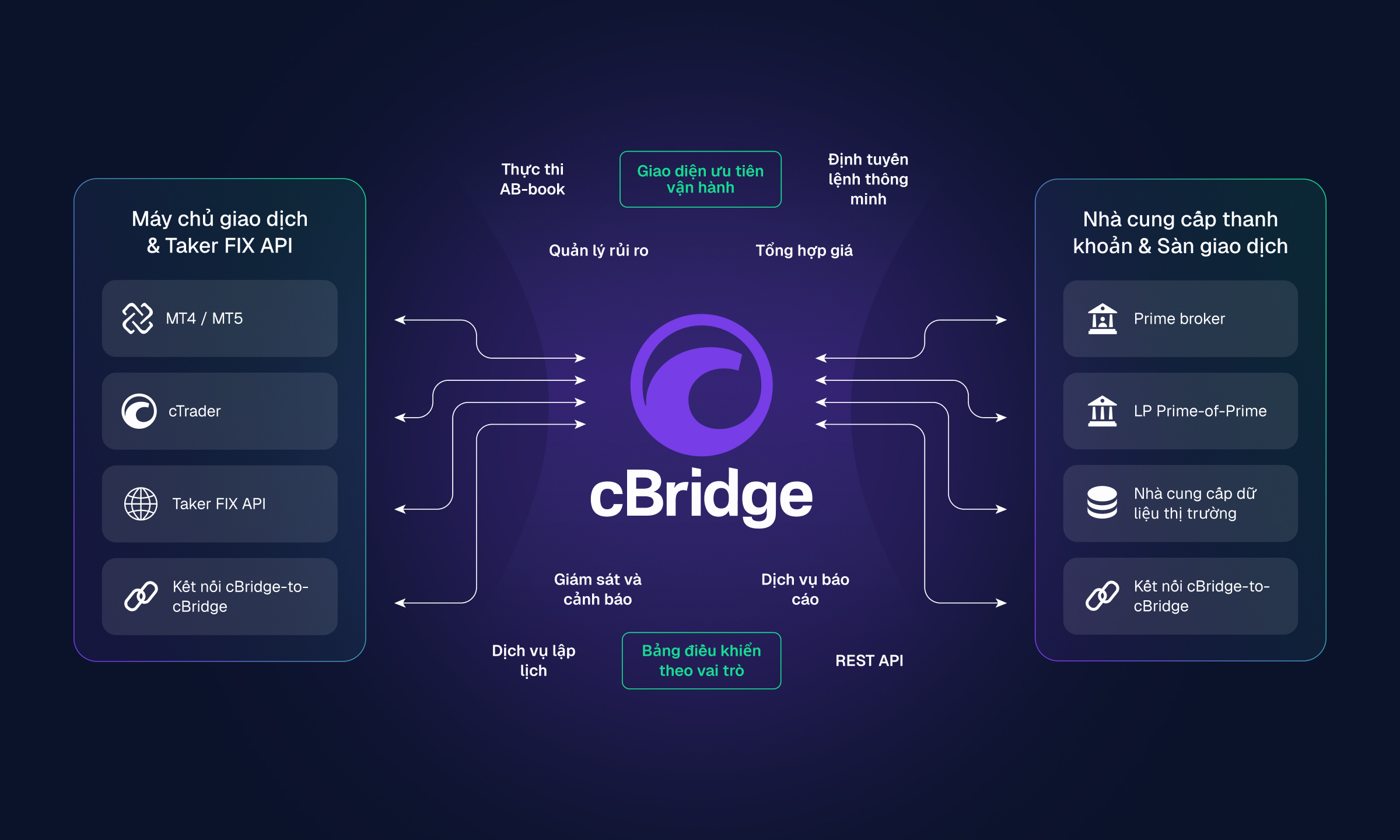 cBridge hoạt động như một giải pháp hoàn toàn độc lập, kết nối các môi trường cTrader, MT4, MT5 và FIX API với nhiều Nhà cung cấp thanh khoản. Các nhà môi giới quản lý quyền truy cập thanh khoản, định tuyến và khớp lệnh tại một nơi, với định giá báo giá thống nhất và quy tắc định tuyến được áp dụng trên tất cả các máy chủ được kết nối. Các tích hợp sẵn sàng và phạm vi giao thức rộng trên giao dịch, định giá và báo cáo giúp quá trình triển khai được kiểm soát.