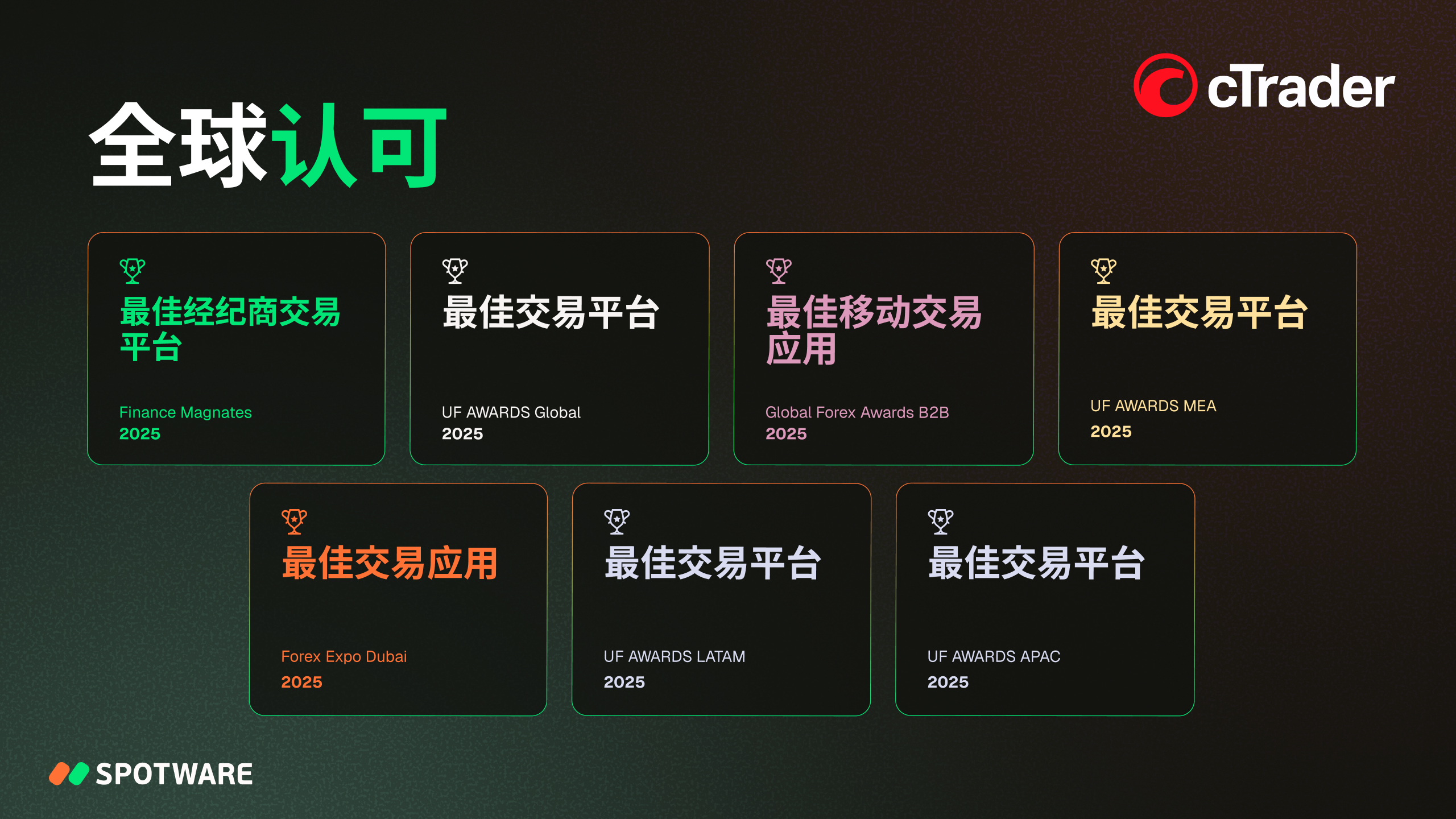 我们获得了众多行业奖项,认可我们在创新、性能和交易者体验方面的领先地位: