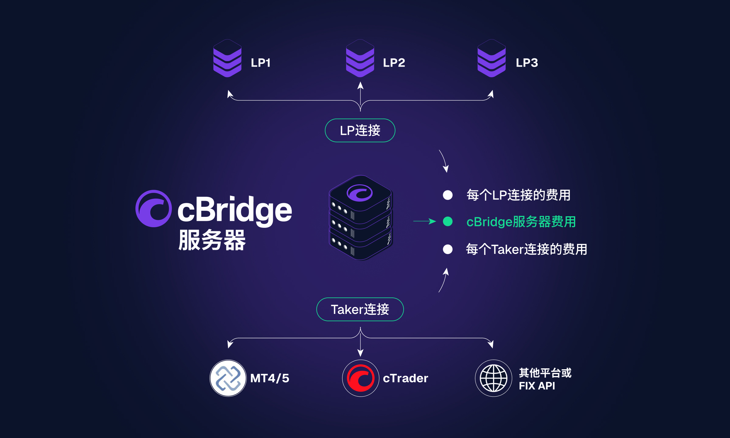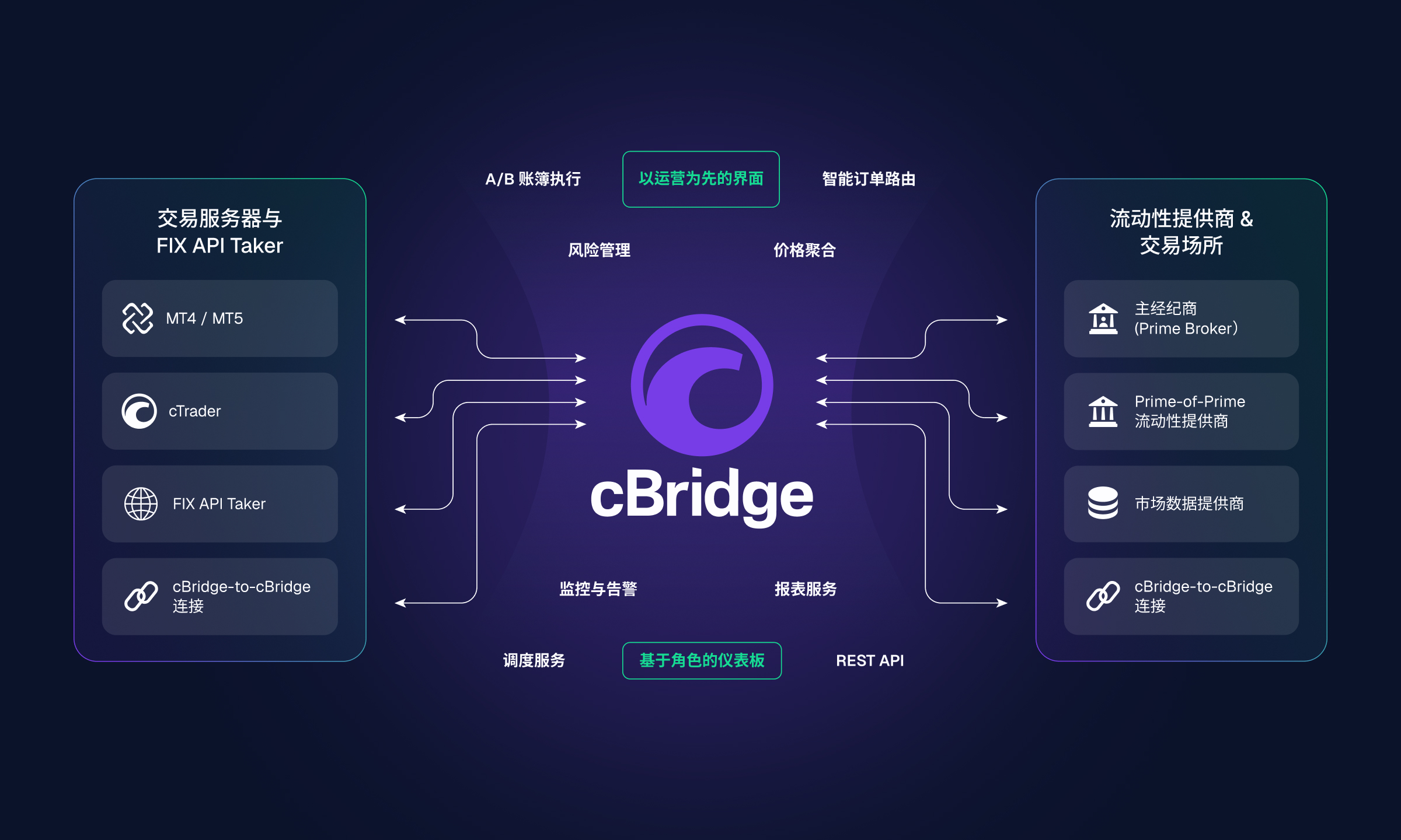 cBridge 作为一个完全独立的解决方案运行,将 cTrader、MT4、MT5 和 FIX API 环境连接到多个流动性提供商。 经纪商在一个地方管理流动性访问、路由和执行,统一的报价定价和路由规则应用于所有连接的服务器。 现成的集成和涵盖交易、定价和报告的广泛协议覆盖使实施过程保持可控。